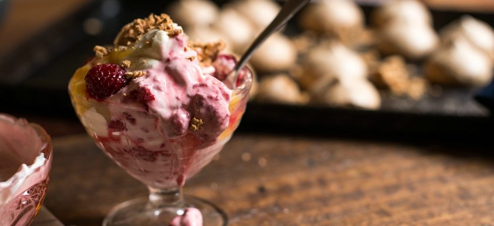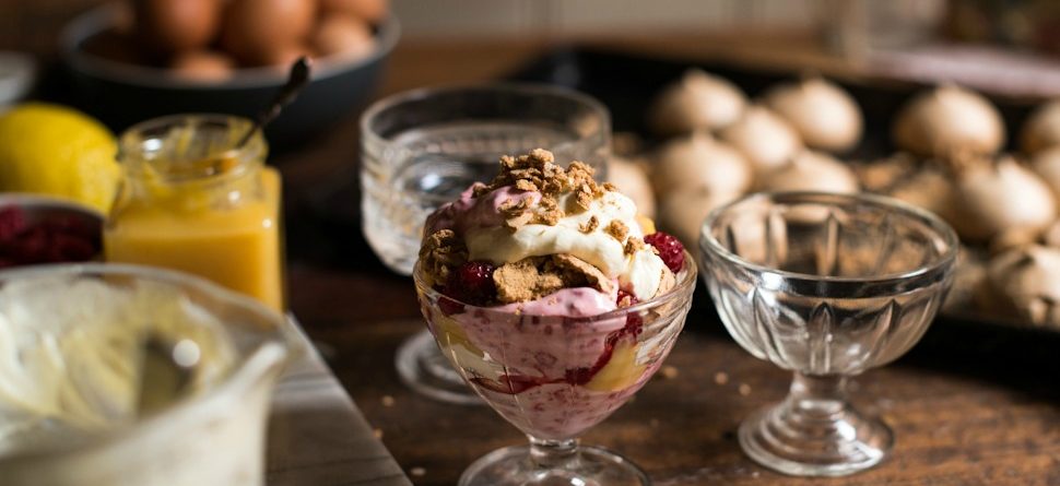 - Next, whip cream and icing sugar until it’s thick and can be dolloped. Add half of the berries and roughly mix. Whip the cream some more if it’s become looser after adding the berries. To assemble, roughly crush some meringue and add to a dessert glass – it looks better when you can see the different layers of colour. Next add a dollop of lemon curd, a dollop of cream and add a few raspberries. Repeat again with meringue, lemon curd, cream and berries. Serve immediately.
